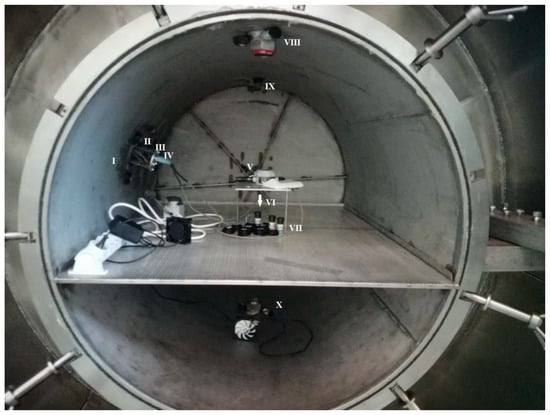 Experimental arrangement of the TASTRAK and RADOSYS nuclear track detectors (I–X) inside the radon chamber (small black disks and cylinders, respectively): close to the radon injection pipe (I–IV), at the bottom plate and in the center of the chamber (V and VI–VII, respectively), near the two upper pipes (VIII–IX) and near the bottom pipe (X).
