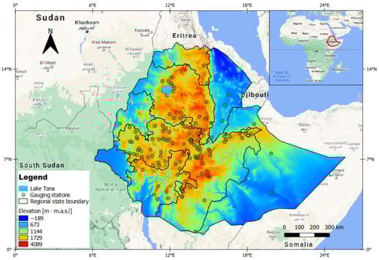 The study area is located in Ethiopia, an eastern African country with a population of around 112 million (The World Bank; https://www.worldbank.org/en/home—last accessed on 4 June 2021). The Ethiopian climate is dry in the southeastern and northeastern parts of the country and wet in the country’s central, western, and southern regions. Mountainous areas range from the west and central to the northern part of the country. The precipitation has two main seasonal variations, where August to September are the wettest months, while December to April are the driest months. The spatiotemporal rainfall patterns are highly inhomogeneous due to the complex orography and convective nature of rainfall [21]. Moreover, the decadal variability of Ethiopian rainfall is known to be significant [22,23]. On the other hand, long-term series indicate either no trend [24] or a drying signal [25], while future model projections indicate a drying trend over the Ethiopian Highlands [26]. The country is well known for catastrophic drought events, as several incidents have resulted in the loss of human lives. Between 1973 and 1975 especially, more than 200,000 people have died due to starvation, malnutrition, and related diseases [27].