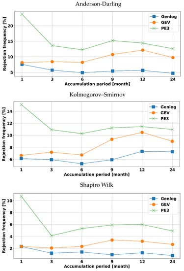 First, the Anderson–Darling (AD), Kolmogorov–Smirnov (KS), and Shapiro–Wilk (SW) tests were made to assess the goodness-of-fit of the distribution for the whole dataset (longer than 30 years). It is observed that the rejection frequency for the Genlog is lower than the GEV and the PE3 at a 5% significance level for accumulation periods 1–24 months. Furthermore, for the Genlog, it is seen that the 1-month aggregation level has the highest rejection frequency, and the rejection prevails in the dry months (December, January, and February). Further research is necessary to find an appropriate probability distribution function for 1-month timescales.