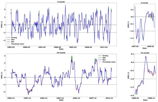 Comparison between the SPEI time series estimated based on the PE3, GEV, and Genlog distributions for 3 and 24 accumulation periods at Melkasa (IAR) gauging station. Zoomed-in plot is given on the side for both 3- and 24-month aggregation levels.