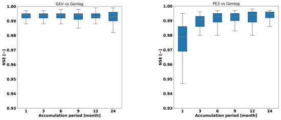 The lowest NSE values are obtained for shorter accumulation periods when comparing the PE3 distribution with the Genlog distribution. Upon comparison of the GEV with the Genlog, median NSE values (from the 125 gauging stations) are relatively independent of the accumulation period. They exceed 0.98, indicating their high degree of similarity, contrary to findings in Ref. [59].
