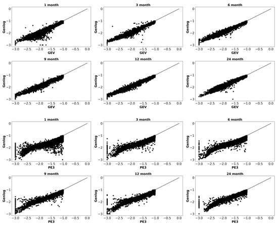 Assessment is made on how well the different distributions managed to capture drought events since the above analysis with NSE only indicates the performance of the overall distribution. A drought event occurs when SPEI drops below minus one. Hence, SPEI values estimated from PE3, Genlog, or GEV are compared against the selected distribution in a scatter plot (Figure 5). The Genlog is considered to yield the most correct SPEI values; thus, a relative comparison is made by taking SPEI estimated using the Genlog as a reference. The Genlog-based and the GEV-based estimations seem to agree on average for all drought values (Figure 5).