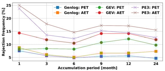 The Genlog distribution captures the water balance better than the other two for all accumulation periods, although comparable results are obtained with the GEV for 1-month accumulation periods. In general, the rejection frequency for Genlog (based on the AD test) is around 5% for most accumulation periods (Figure 2). A similar pattern is seen based on the Kolmogorov–Smirnov (KS) test, but the rejection frequency is lower than for the AD test, which indicates a better fitting in bulk than in the tails of the distribution.