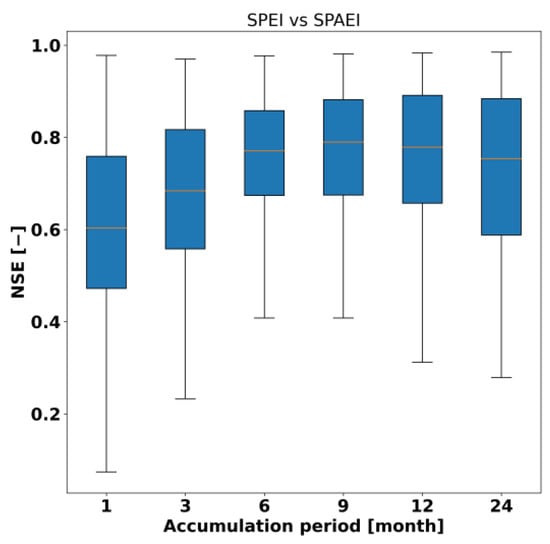 NSE equal to one means that the candidate and the reference distribution are equal, while NSE values lower than 0.5 are commonly considered to indicate poor similarity. Note that NSE has been used before in the context of comparing drought indices [20,55].