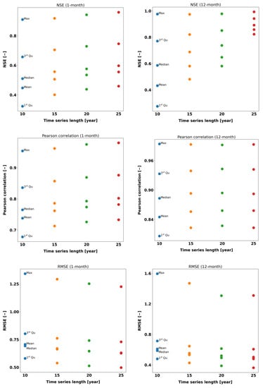 The NSE and Pearson correlation coefficient increase as the time series length increases while the RMSE decreases. For some gauging stations, at shorter/longer accumulation periods, the 10-, 15-, 20-, and 25-year data produce SPEI values significantly different from those estimated using the benchmark data. Following the definition set in Ref. [55], where NSE above 0.4 is satisfactory, our result suggests that only a quarter of the NSE has values less than 0.4 for 15 and above years of time series. Moreover, the statistics indicate that using 20 and 25 years of data will result in almost similar (quartiles of the NSE is almost identical) SPEI values (Figure 8). This indicates the applicability of using shorter-length in situ data to estimate SPEI, compared to the 30 years recommended by the World Meteorological Agency (WMO). Similar results were obtained for SPI estimations using 17 years of data in China [20].