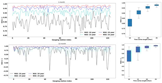 The variation of the NSE among 10-, 15-, 20-, and 25-year water balance data for 1-month and 12-month accumulation periods. In addition, boxplots on the side are presented to summarize the NSE from the 125 gauging stations. This is based on 10, 15, 20, and 25 years of data selected by looking at the most drought-hit period.