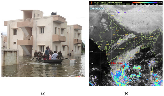 The coastal cities of Tamil Nadu including Chennai and parts of Cuddalore experienced record levels of rainfall (490 on a single day) between 28 November and 2 December 2015, leading to ruinous flooding over the region [22,23]. The event caused 500 human casualties and a mass displacement to the tune of 1.8 million. Figure 1a shows a snapshot of submerged regions in Chennai city during this extreme precipitation event.