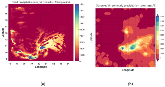 Precipitation rates: (a) modelled total precipitation rate (mm/h) from WRF’s WDM6 microphysical scheme; (b) observed three-hourly TRMM (Tropical Rainfall Measuring Mission) precipitation rates (mm/h) for 2 December 2015 12:00:00-15:00:00 (1730-2030 IST) (URL: https://disc.gsfc.nasa.gov/datasets/TRMM_3B42_7/summaryTRMM2011, accessed on 15 December 2021).