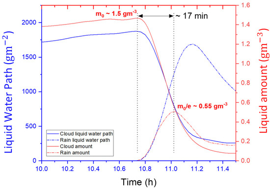 The onset time of precipitation is generally a time measure for the initial cloud mass () to decrease to 1/ of the starting amount (Ghosh and Jonas [21]). One can notice from Figure 3 that the time taken for ~ 1.5 to decrease to ~ 0.55 was indeed ~17 .