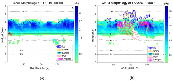 Figure 5a,b clearly show cloud conversion into rain over vertical levels between 3 and 4 (Figure 5a); subsequently, at a later stage (22 beyond the initial time; see Figure 5b), one can observe that the rainwater mixing ratio rapidly increased—over these regimes, rain amounts increased contiguously as cloud amounts fell.