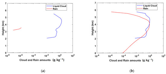 Figure 4a,b also illustrate the cloud conversion phase. During the initial period, cloud conversion into rain is observed at approximately 3.54 above ground (red contours in Figure 4a; also see Figure 3). During the later stages, partitioning between the cloud and rain amounts was rapidly hastened over the upper reaches of the warm cloud (~4 ; see Figure 4b)—this was also observed in an earlier study [37].
