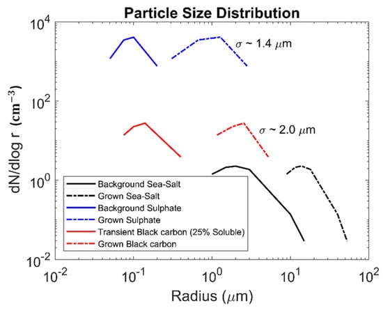 The dry aerosol profile (solid lines) over the city is shown in Figure 6, where the spectra comprise background sulphate (sourced from the oxidation of dimethyl sulfide (DMS) as well as from overland pollutants) and sea salt particles (film and jet modes sourced from the Bay of Bengal), along with partially soluble soot and black carbon particles mainly sourced from a heavy traffic flow in the city, termed the ‘transient’ mode [31,33,38,39]. From Figure 6, we find that the transient black carbon mode is sandwiched between the sulphate and the salt modes.