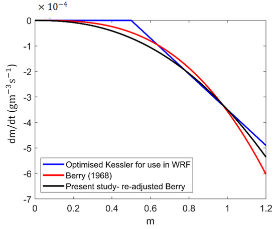 We optimized the Kessler scheme with results from Berry [42], and the procedure proved to be extremely attractive because it could account for cloud spectral properties and any associated variations in the drop size distribution (DSD). Three cloud water conversion terms are now compared: the ‘optimised’ Kessler [14], the Berry [42] and the new correlation (present analyses; see Equation (6)). The ‘optimisation’ is visible in the solid blue line (Figure 7)—a realistic cloud auto-conversion threshold value of the order of 0.5 was estimated based on a procedure from Yin et al. [44] for warm rain processes in Asian clouds. When cloud water amounts are less than this threshold, there is no change in the cloud water amounts; when exceeded, this results in a linear decline bound by the magnitude of the rate. The optimization, in essence, combines appropriate values of both the rate and the threshold to yield a decay curve, closely proxying the actual quadratic Berry curve (the continuously decreasing black and red curves in Figure 7). In fact, as we show later in the next section, the decay rates also yield a very realistic precipitation onset time.