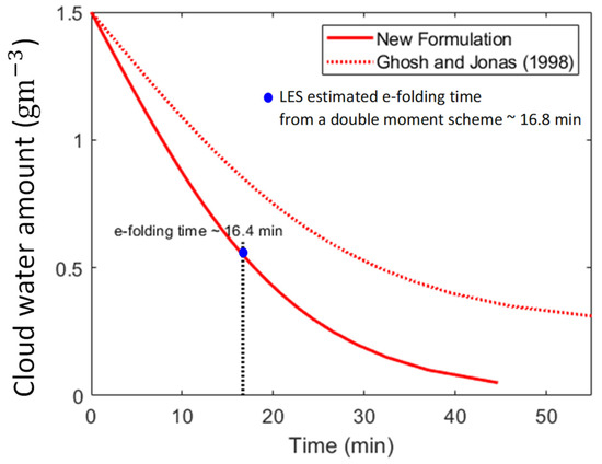 For the present case study, with , and 1.5 , we observe that , meaning that Equation (17) should be used to compute the cloud water conversion rates. This is shown in Figure 8, where we show a comparison with the earlier Ghosh and Jonas [21] formulation which ignored the cross-sectional areas and fall velocities of the small collected cloud drops with radius . The actual onset times are then estimated as an -folding time, i.e., the time instance when the initial cloud water amount has depleted to of the original amount () is a measure of the onset time.