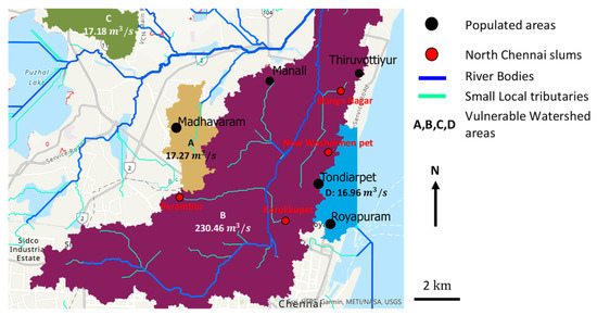 ArcGIS is a geographical information system model which facilitates the handling and analyses of geographical information through image digitisation procedures [55]. Watershed delineation in ArcGIS is a six-step procedure involving, first, the usage of the Fill tool applied to a DEM file. This step quality checks the elevation file and removes surface imperfections (the DEM file for the present case study was sourced from Bhuvan, which is a geo-platform managed by the Indian Space Research Organisation (ISRO); URL: https://bhuvan.nrsc.gov.in/home/index.php, accessed on 10 November 2021). This is followed by ascertaining the flow directions using the Flow Direction algorithm which determines the flow of water across the surface based on the topography of the landscape. Subsequently, the Flow Accumulation tool is used to identify the upstream cells flowing into the downstream grids. In essence, the low-lying areas subsume cells with higher flow accumulation values. To demarcate the watersheds, pour points are identified near the exposed regions through a handle on the flow direction raster. The pour points are subsequently snapped to the closest cell of a high flow accumulation before using the Watershed algorithm. Figure 9 shows the drainage map of the study region generated from GIS showing major river streams and tanks along with the vulnerable watersheds in the North Chennai slum region. The heavily populated areas as well as the slum regions are shown with black and red markers, respectively.