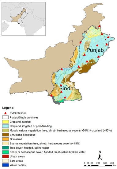 Study area and location of the 15 weather stations used in this work (red triangles), together with a land-use map for the Punjab and Sindh provinces. Note that the Jammu and Kashmir regions, whose current status has not yet been agreed upon the different parties involved, are not shown in the map. Sources: PMD and FAO-Pakistan.
