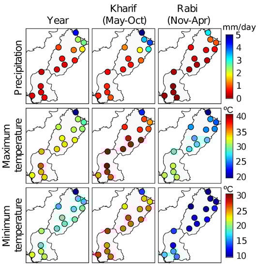 Figure 2 shows the observed mean climatology for precipitation, maximum and minimum temperature (in rows) for the 15 PMD stations considered for the period 1997–2016, for the entire year and two seasons of particular interest, Kharif (May–October) and Rabi (November–April), which cover the growth cycles of the four main crops in the IRB: wheat, cotton, rice and sugarcane (see Table 2).