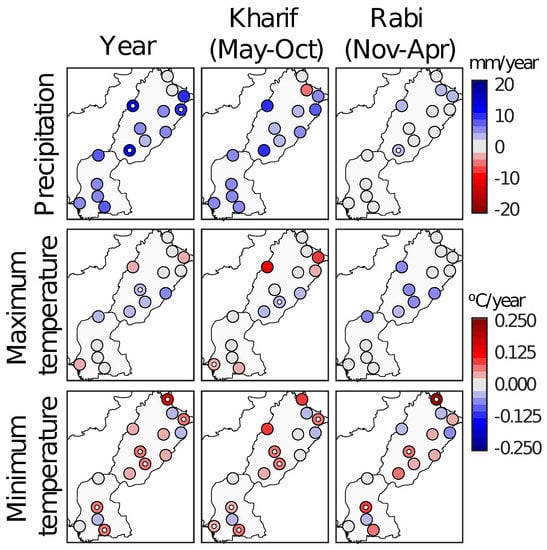 Figure 3 shows the observed trends in annual precipitation, maximum and minimum temperature (in rows) over the 15 PMD stations considered, for the entire year, the Kharif and the Rabi seasons (in columns). Significant (95% confidence level) trends are marked with a white dot.