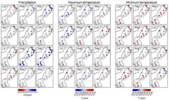 Observed annual trends in precipitation, maximum and minimum temperature (panels from left to right) over the period 1997–2016 for each of the twelve calendar months. Significant (95% confidence level) trends are marked with a white dot.