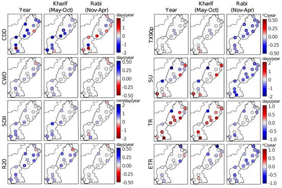 Figure 5 shows the observed annual trends for the precipitation and temperature-based extreme indicators listed in Table 3 (left and right panel, respectively). In agreement with the results from Figure 3 and Figure 4, the analysis of precipitation-based indicators reveals an overall decrease in the number of consecutive dry days (CDD), driven by a negative shift in the Kharif season. During the Rabi season, the number of CDD is increasing in some parts of the basin, which points out to increased periods without rain during the winter months. Over the basin, there is a slight increase in the number of consecutive wet days (CWD) during the Kharif season, however no change during Rabi. The Simple Daily Intensity Index (SDII) shows a slight increase in Kharif and no change during the Rabi season. The analysis also finds an increase in the number of very heavy precipitation days (R20) over the period analyzed driven by changes in the Kharif season. The results support previous discussion of increasing intensity of rain during the wet summer season, however extended dry periods during the already dry winter season. This decrease in dry days may impact non-irrigated Rabi crops, in particular wheat and sugarcane, which will be in critical growth phases during this period [,].