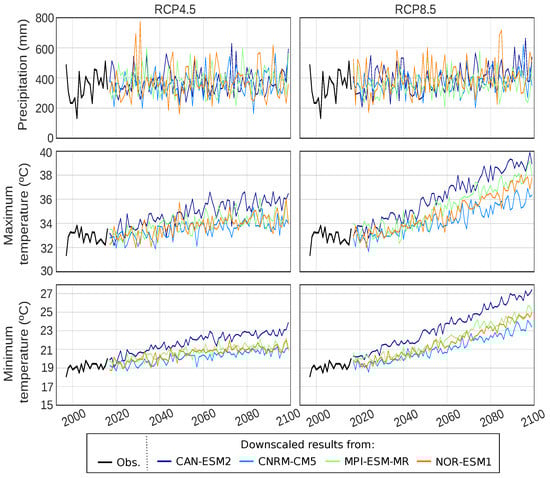 Figure 6 shows the projected annual precipitation, maximum and minimum temperature averaged along the 15 PMD stations up to 2100, as obtained from statistical downscaling. On the one hand, projected precipitation exhibits large inter-annual variability, with an average increase of about 10–20% for the end of the century (with respect to the historical period). On the other hand, beyond the uncertainty due to the choice of ESM, projected maximum (minimum) temperature exhibits an average increase of about 2 °C/5 °C (2 °C/6 °C) for the end of the century under the RCP4.5/RCP8.5, respectively. All these results are in agreement with previous studies (see, e.g., []).