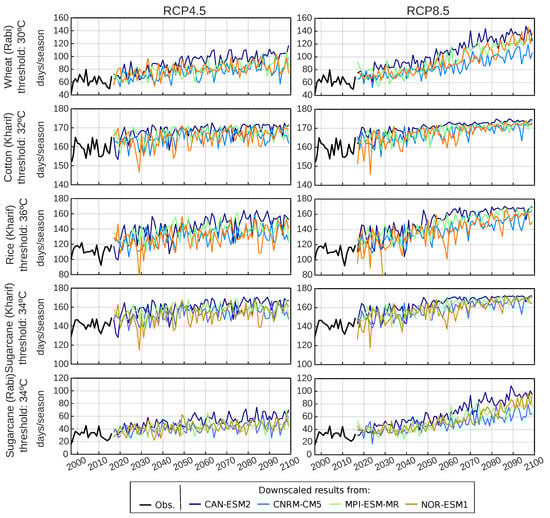 Figure 7 shows, for each crop (in rows), the annual projections of the number of “hot” days averaged over the 15 PMD stations up to 2100, as given by the different ESMs used (in colors) under the RCP4.5 and RCP8.5 scenarios (left and right column, respectively), while increases in temperature and CO enrichment support the growth and development of wheat [], temperatures above 30 °C can result in a decline in pollen viability []. The first row of Figure 7 shows that the number of days per year with maximum temperature above 30 °C in Rabi is projected to increase from about 70 to up to 140 days/season (depending on the ESM and RCP) by 2100, which suggests that this crop’s productivity will likely be negatively affected by heat stress over the studied region. More intense and shorter rainy periods may compound this negative effect; however, in the mainly irrigated basin, it is expected to be limited compared to temperature drivers.