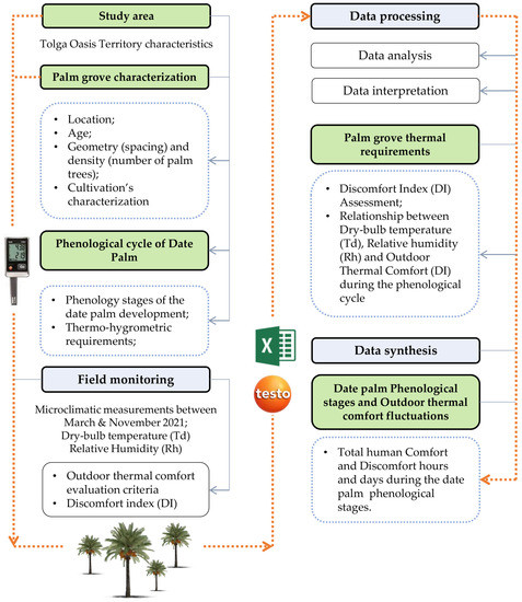 The research methodology focuses on the assessment of human thermal stress inside a palm grove during the phenological cycle of the palm tree Phoenix dactylifera. Furthermore, the study demonstrated the impact of thermal requirements relevant to the date palm’s growth stages on the thermal heat stress of the inhabitants (cultivators) throughout the palm groves in Tolga territory.