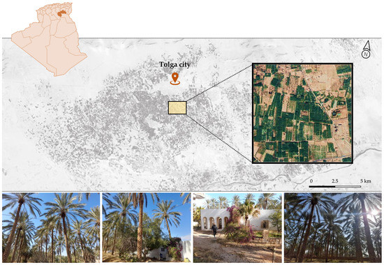 Tolga oasis territory is located in the Ziban region in the southeast of Algeria, behind the Saharan Atlas Mountain range, which is considered as natural barrier between the north and the south, and includes all the area at the foot of the Atlas range towards the large desert, and is endowed with different Saharan landscapes [5,6]. Named ‘the gateway to the desert’ due to its location at the beginning of the Sahara Desert, the Ziban region plays a role in encounters, exchange, and transition between the north and south of Algeria [4].