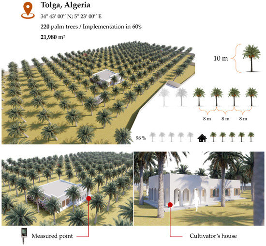 The strength of the current study relates to the empirical investigation of the human thermal requirements inside a productive palm grove of an oasis settlement. The context of the study combines the cultivated area, which includes a large number of palm trees (220) and a few other fruit trees, and the cultivators’ house which is located in the middle of the palm grove. The study used field monitoring, which was carried out from March to November 2021 to cover the entire duration of the phenological cycle of the date palm.