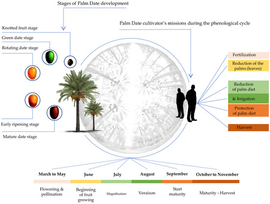 During the phenological cycle, cultivators of date palm perform several operations to ensure good cultivation of their own crops. These missions are distributed among cultivators inside the palm groves and relate to the date palm development stages, including: (i) fertilization, (ii) reduction of palms (leaves) (cutting off the dry ones), (iii) reduction of palm dates (an operation to reduce excess date palm branches), (iv) irrigation, (v) protection of the palm dates, and (vi) harvest of the fruits.