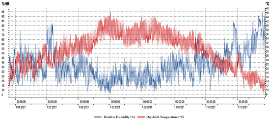 Dry-bulb temperature (Td) and relative humidity (RH) variations between 25 March and 25 November 2021 inside the study site.