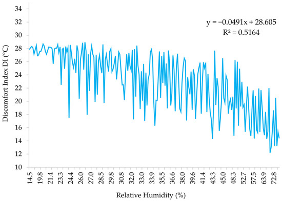 Relationship between relative humidity (RH) and the discomfort index (DI) during the phenological cycle at the study site.