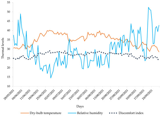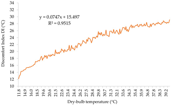 The discomfort index (DI) is based on an extensive series of microclimatic monitoring data [36,37,50]. It depends on the dry-bulb air temperature (Td) and relative humidity (RH). Human discomfort increases as the DI increases.