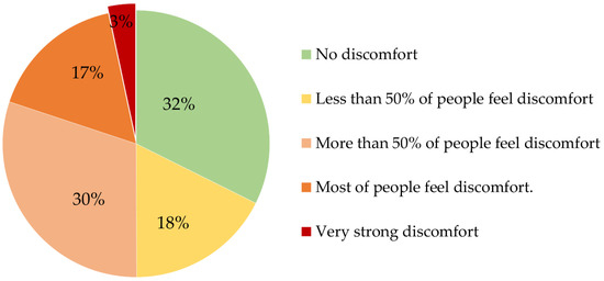 Figure 9 summarizes the hourly thermal stress rates which could be felt by cultivators during the phenological cycle inside their palm groves. As shown, the neutral zone (no discomfort) had an average of 32% versus 68% thermal discomfort, which covered four thermal stress zones: 18% for moderate discomfort (less than 50% of people feel discomfort), 30% for medium discomfort (more than 50% of people feel discomfort), 17% for high discomfort, and 3% for very strong discomfort.