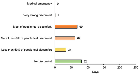 During the 82 days of neutral thermal sensitivity, the average DI was 17.9 °C. On the other hand, on the 34 days, 62 days, and 69 days defined as the slight discomfort, medium discomfort, and high discomfort zones, the average DI was 22.5 °C, 25.5 °C, and 27.8 °C, respectively.