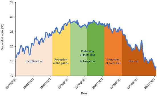 The study results indicated that in 5.5/8 months of the phenological cycle, the cultivators work under extreme thermal conditions. As expected in our hypothesis, the humidity was not a dominant climatic aspect in this period. Above the 25 °C, human discomfort increases, and humans become extremely uncomfortable when temperatures inside the palm grove reach 30 °C or slightly more.
