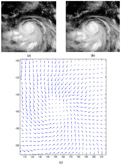 Illustration of the motion field. (a) IR image at 1730 UTC on 3 August 2014; (b) IR image at 1800 UTC on 3 August 2014; (c) motion field calculated using the proposed method.