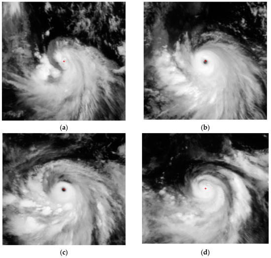 Center of the TC calculated using the proposed method. (a) IR image at 0530 UTC on 1 August 2014; (b) IR image at 0600 UTC on 2 August 2014; (c) IR image at 0000 UTC on 3 August; (d) IR image at 1830 UTC on 4 August.