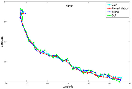 Super TC Haiyan was formed on 3 November 2013 and was the strongest tropical cyclone in the world in 2013. The TC gradually intensified and became a super strong TC on 7 November 2013. From 0600UTC on 3 November 2013 to 1200UTC on 11 November 2013, approximately 360 FY-2E IR images sequences were processed and the centers of the TCs were identified. The tracking results for the center of Haiyan along with the comparison of the CMA, SRPM and DLF methods are illustrated in Figure 5. It could be seen that the proposed algorithm was tracking results of the best path that were quite close to the optimal path of CMA. The average tracking error of the proposed algorithm was around 40.85 km, and that of the SRPM and DLF methods were about 43.72 km and 40.91 km, respectively; thus it could be observed that the error of the proposed algorithm was smaller than other similar methodologies.