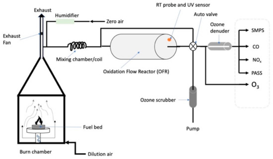 Instruments used for the characterization of fresh and aged biomass burning emissions included a Three Wavelength Photoacoustic Soot Spectrometer (PASS-3; Droplet Measurement Technologies (DMT), Boulder, CO, USA), an OFR (Aerodyne Research Inc., Billerica, MA, USA), an Ozone Monitor (Model 205; 2B Technologies Inc., Boulder, CO, USA), and a Scanning Mobility Particle Sizer (SMPS; TSI, Shoreview, MN, USA) comprising a TSI 3080 Electrostatic Classifier and a TSI 3775 Condensation Particle Counter (CPC). Carbon monoxide (CO) concentrations were measured with a CO monitor (Model 8830 CO analyzer, LEAR Siegler Measurement Controls Corporation, Englewood, CO, USA) and NOx (nitrogen dioxide (NO2) and nitric oxide (NO) concentrations with a chemiluminescence NOx analyzer (Thermo-Environmental Instruments, Inc., Franklin, MA, USA). Individual components of the experimental setup are described in more detail in the following subsections.