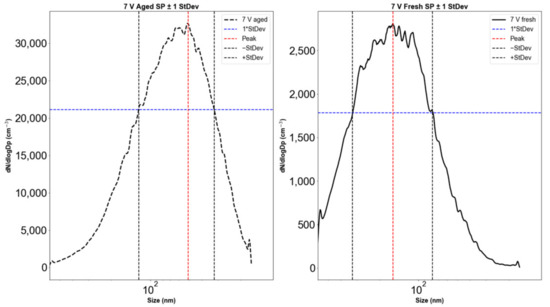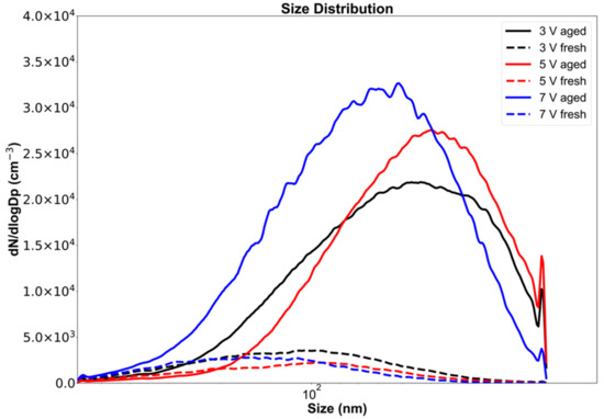 This large variation in the total particle volume may be due to the type of particles generated after aging. Although the count for aged particles is 5 to 10 times greater than that of fresh emission counts, these particles are mostly smaller in size as shown in Table 2. If the number of large particles decreases or if larger particles partly evaporate during aging, total particle volume emissions may decrease due to aging, which happened at 5 V (44 days) in Table 3. However, if net particle mass is generated during aging, possibly due to new particle generation and the growth of existing particles, the total particle volume of the aged emissions will outgrow the fresh as it did at 7 V (61 days) in Table 3. Here, the fresh particles were larger but fewer in count by one order of magnitude. Once aged, the sum of the smaller volumes overpowered the sum of the fresh volumes causing an increase in the total particle volume by ~88.0%. Determining the voltage thresholds between particle volume increase and decrease will require additional experiments and analysis.