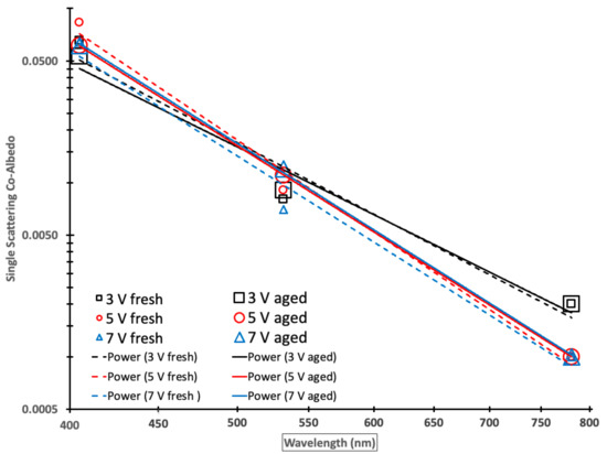 We hypothesize that during aging, 405-nm SSA initially (19 days of aging) strongly increases due to the bleaching of chromophores [97] and the addition of less-absorbing particle material, causing a strong decrease in the absorption and less (about half) of that decrease in the scattering coefficients, followed by little additional net changes over the next 25 days (total of 44 days) of aging. Aging to 61 days strongly increases the absorption by ~56%; however, this is more than balanced by an even larger increase in scattering by ~71%. These large increases are likely related to the large increase in the total particle volume of ~88% after 7 V aging. The longer wavelengths of 532 and 781 nm showed smaller absolute and fractional changes in the SSA values from fresh to aged, in which some increased and others decreased.