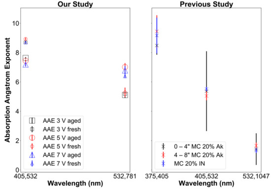 In a previous study performed by Sumlin et al. [99], similar results were observed for Alaskan peat and Indonesian peat fuels. When harvesting the Alaskan peat fuel, the samples were extracted at different depths in the ground with results for depths of 0–4 and 4–8 depths shown in Figure 5, right panel. Moreover, to compare our results to those of Sumlin et al. [99], only their results for peat with a fuel moisture content of 20% are shown here. Their samples were not densely packed, and their biomass burning emissions were aged after removing gaseous compounds through denuding (unlike ours), which may explain why their AAE values were lower by 2–3 for the 405–532 nm wavelength range. However, note the large error bars (caused by sampling artifacts) of Sumlin et al. [99] shown in Figure 5 (right panel), making these differences barely significant.