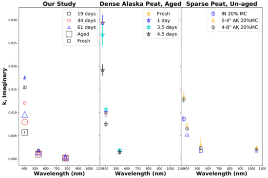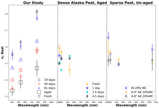 Figure 6 shows the retrieved real part n of the particle refractive index. The left panel shows the results from our laboratory biomass burns of Siberian peat, indicating that the real part of the refractive index increased to nearly being linear with the wavelength, which can be interpreted as anomalous refraction. Some previous studies [99] did not demonstrate this trend while others showed some anomalous refraction [8]. Note that the retrieved real parts of the particle refractive index for fresh smoke varied significantly between burns (19, 44, and 61 days of aging burns) and changes due to aging were analyzed for individual burns. Consequently, our retrieved real parts of the particle refractive index decreased after 19 days of equivalent aging, increased after 44 days of aging, and strongly decreased after 61 days of aging. These trends are opposite to the trends observed for the total particle volume as discussed in Section 5.1 and shown in Table 3. The center and right panels show the results from previous experiments by Sumlin et al. [34,99]. Again, comparisons were made with the 20% fuel moisture content for sparsely packed Indonesian and Alaskan peat and densely packed aged Alaskan peat. In contrast to Sumlin et al. [34,99], our study extended the aging period of biomass burning aerosols beyond 4.5 days and up to 2 months (7 V, 61 days) and did not remove gaseous compounds through denuding. Note that Sumlin et al. [34,99] showed different trends in the retrieved real parts of the particle refractive index as a function of the wavelength (not observed by us) and partial reversal of aging-induced changes (observed by us).