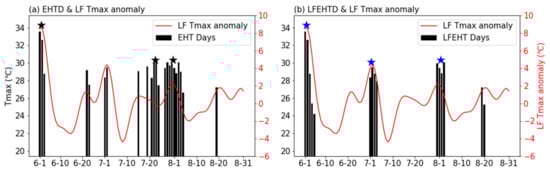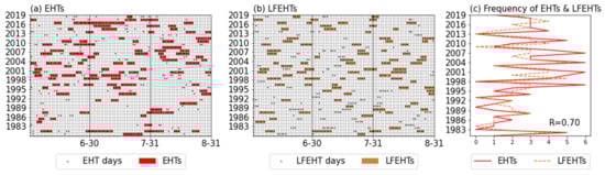 - Low-frequency extreme-high-temperature event: The definition is the same as the extreme-high-temperature event, but the filtered daily maximum temperature sequence replaces the daily maximum temperature, and the extreme-high-temperature days must occur during the event in order for a low-frequency extreme-high-temperature event (LFEHT) to be identified.