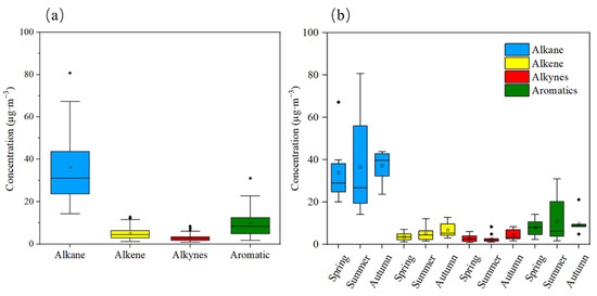 Concentration of various VOC groups in (a) total sampling time and (b) different seasons.