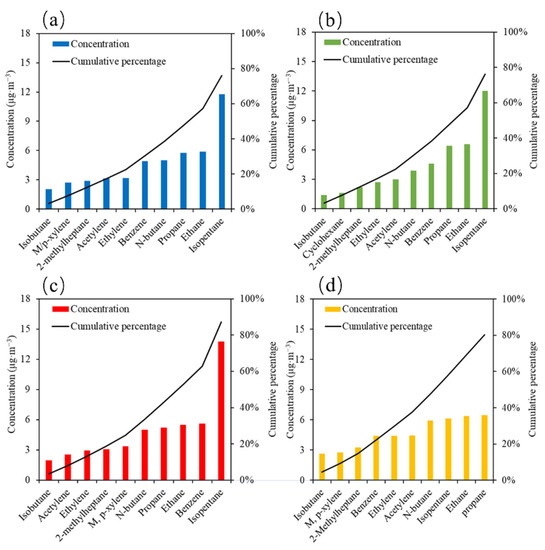 Top 10 VOC concentrations during (a) total sampling time, (b) spring, (c) summer and (d) winter.