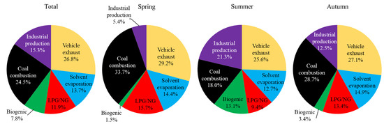 Figure 3 shows the source apportionment of VOCs according to the PCA. Vehicle exhaust was the largest source (27.5%) of atmospheric VOCs, and coal combustion was the second largest one (23.5%). Additionally, the contributions of industrial production, solvent evaporation, LPG/NG, and biogenic emissions to atmospheric VOCs were 17.4%, 13.5%, 9.5%, and 8.7%, respectively.