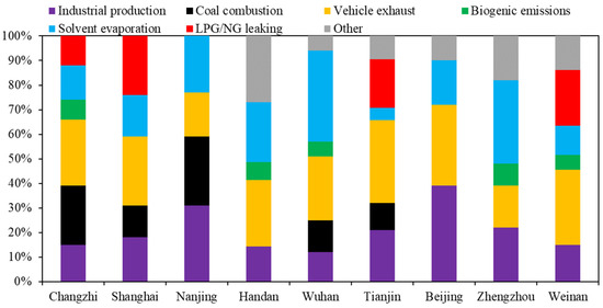 Figure 4 shows the source apportionment of VOCs in seven Chinese cities during a similar period, including Shanghai, Nanjing, Handan, Wuhan, Tianjin, Beijing, Zhengzhou, and Weinan [22,23,40,41,60,63,64,65]. Vehicle exhaust was the main source of VOCs in several cities. The contribution of vehicle exhaust (27%) in Changzhi was lower than those in densely populated cities such as Beijing (33%) and Shanghai (28%). As a typical industrial city, the contribution of industrial production to VOCs in Changzhi was higher than that of southern cities such as Wuhan (12%) and Handan (11%) but lower than that of the northern Chinese city of Tianjin (20%). In addition, the contribution of solvent evaporation in Changzhi was significantly lower than those in the southern cities of Wuhan (37%) and Nanjing (23%). In recent years, the coal chemical and pharmaceutical industries in Changzhi have grown rapidly. The production processes in these industries consume large amounts of organic materials and produce large amounts of VOCs. Therefore, industrial production and solvent evaporation have become important sources of local VOCs. Nevertheless, steel, electricity and coking are still the most important industries in Changzhi, and they have a high energy demand, which is mostly produced by coal combustion. Therefore, the contribution of coal combustion was significantly higher in Changzhi than in other cities. The contribution of biogenic emissions to VOCs was similar across all investigated cities, ranging from 6 to 9%.