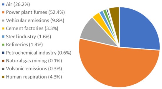 Figure 1 depicts the CO2 emission sources across the globe with their percentage contributions. According to Figure 1, the emission of CO2 is inevitable due to the rapid growth of the chemical, food, electronic, paper and pulp [19], and cement [17] industries, petroleum refineries, and metal/mineral production owing to fossil fuel combustion [20,21,22], which accounts for more than one-third of the worldwide CO2 emission in the 40–70 °C range [23]. On the contrary, though natural gas (NG) is considered a clean energy source, high-pressure NG wells act as significant CO2 emitters when vented into the atmosphere after gas purification [15,24,25]. Biogas upgradation also releases CO2 into the atmosphere [25]. Nevertheless, according to the report from Pacific Institutes, bottling water plants also acted as CO2 emission sources to pump more than 2.5 million MT of CO2 in 2006 [6].